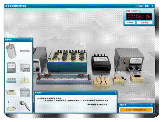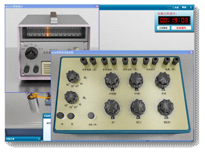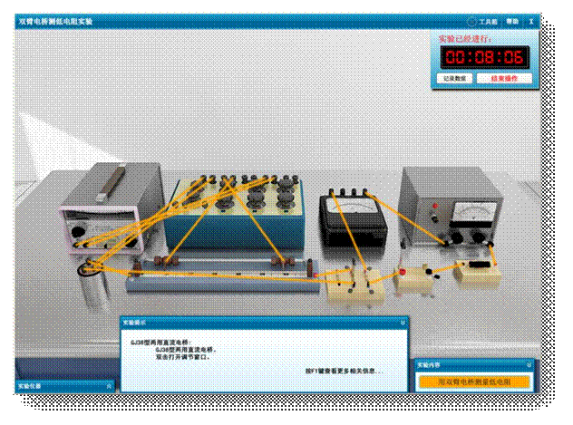 6.闭合开关,打开电压源的电源开关,闭合双刀双掷开关,按下双臂电桥的“粗”按钮。这时检流计示数发生偏转,调节双臂电桥的R,是电桥平衡,记录R的值。