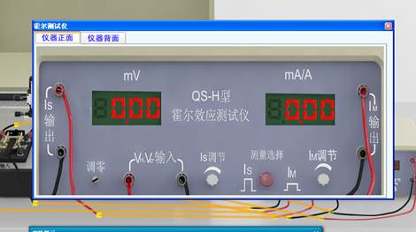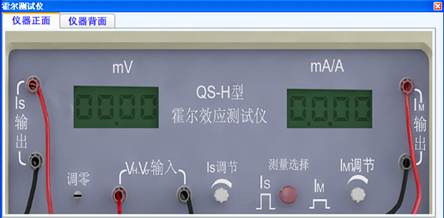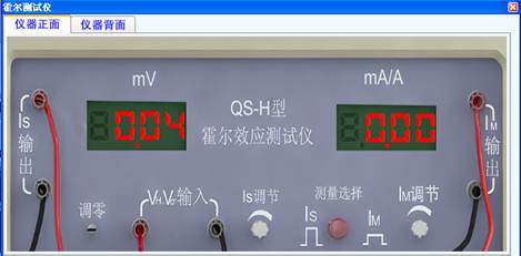 双击桌面上霍尔效应测试仪小图标,弹出霍尔效应测试仪的调节窗体;主要有两个显示的图面,一个为背景图主要是控制该仪器的电源的开关。正面图主要控制控制电流和励磁电流的输出大小,并测量返回的电压大小。该仪器每次开启电源时会产生误差,需要手动去校准。