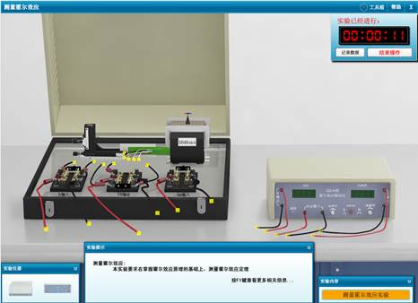界面的右上角的功能显示框:当在普通实验状态下,显示实验实际用时、记录数据按钮、结束操作按钮;在考试状态下,显示考试所剩时间的倒计时、记录数据按钮、结束操作按钮、显示试卷按钮(考试状态下显示)。