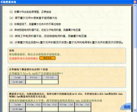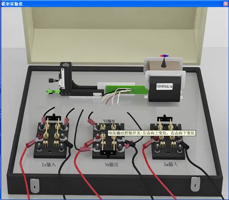 双击桌面上霍尔效应试验仪图标,弹出霍尔效应试验仪的调节窗体。初始化时霍尔效应试验仪上的开关位置是按照标准形式放置的,3个开关能随意拨动,也能改变霍尔元件片在磁场中的的位置。