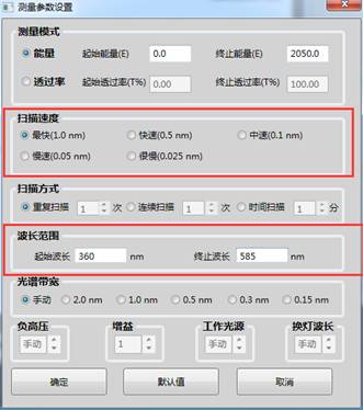 6)点击参数设置按钮,设置波长范围中起始波长为360nm,终止波长为585nm,选择合适的终止能量,扫描速度默认为最快(选择波长范围后,需要进行波长检索,为节省时间,扫描速度选最快);