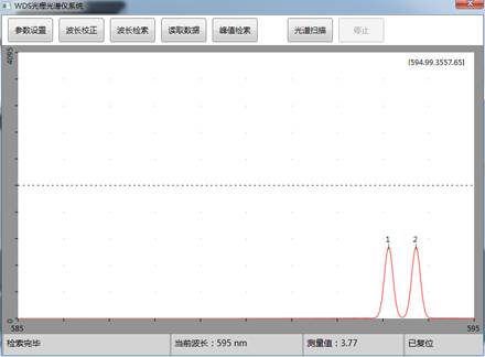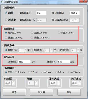 4)点击参数设置按钮,设置波长范围中起始波长为585nm,终止波长为595nm,扫描速度默认为最快(选择波长范围后,需要进行波长检索,为节省时间,扫描速度选最快);