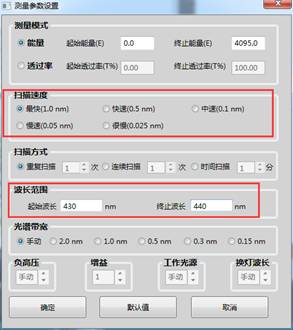 4)点击参数设置按钮,设置波长范围中起始波长为430nm,终止波长为440nm,扫描速度默认为最快(选择波长范围后,需要进行波长检索,为节省时间,扫描速度选最快);