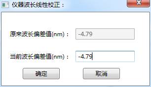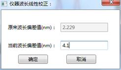 8)击波长校正按钮,弹出波长线性校正对话框,用数据列表中593.1nm波长值减去理论值589.0nm,将结果记录到当前波长偏差值,点击确定按钮,完成单色仪定标;