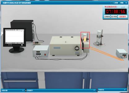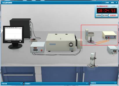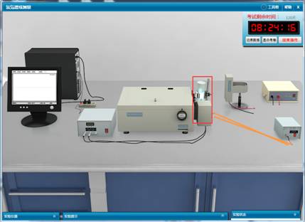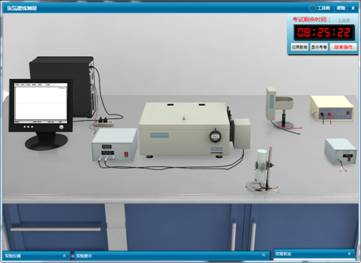 界面的右上角的功能显示框:当在普通做实验状态下,显示实验实际用时、记录数据按钮、结束实验按钮、注意事项按钮;在考试状态下,显示考试所剩时间的倒计时、记录数据按钮、结束考试按钮、显示试卷按钮(考试状态下显示)、注意事项按钮。