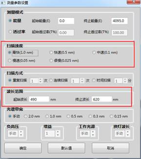 1)点击参数设置按钮,设置波长范围中起始波长为490nm,终止波长为620nm,扫描速度默认为最快(选择波长范围后,需要进行波长检索,为节省时间,扫描速度选最快);