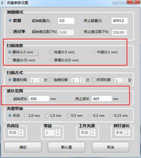 4)点击参数设置按钮,设置波长范围中起始波长为400nm,终止波长为660nm,扫描速度默认为最快(选择波长范围后,需要进行波长检索,为节省时间,扫描速度选最快);