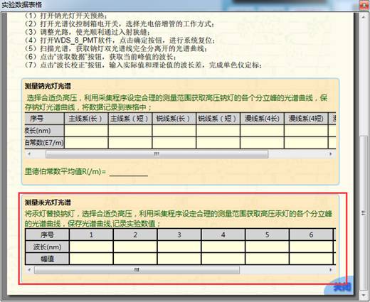 8)点击纪录数据按钮,弹出实验数据表格,将氢氘灯光谱波长纪录到表格中,计算里德伯常量;