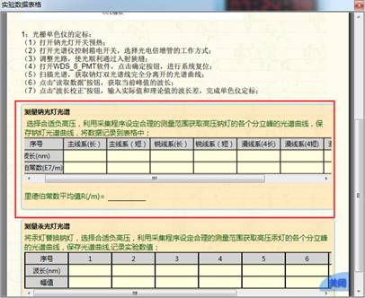 10)点击纪录数据按钮,弹出实验数据表格,将氢氘灯光谱波长纪录到表格中,计算里德伯常量;