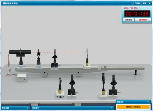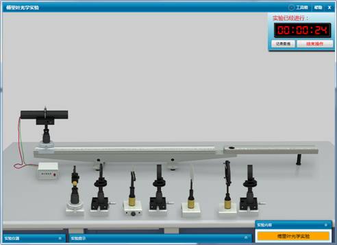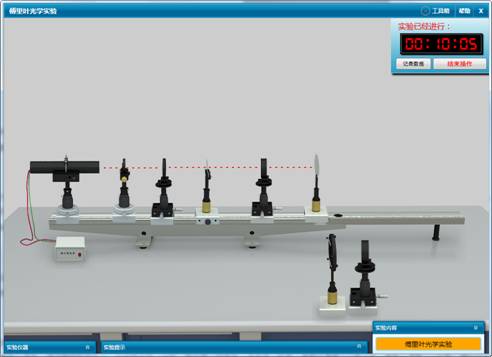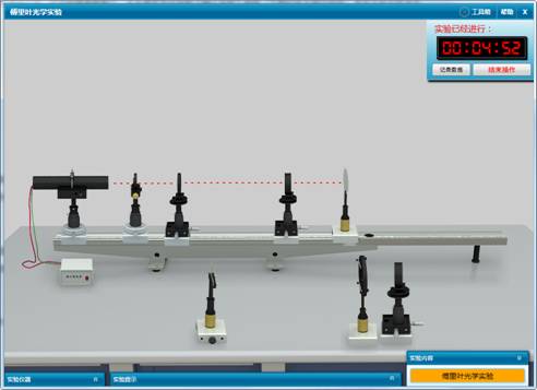 实验状态辅助栏:显示实验名称和实验内容信息(多个实验内容依次列出),当前实验内容显示为红色,其他实验内容为蓝色;可以通过单击实验内容进行实验内容之间的切换。切换至新的实验内容后,实验桌上的仪器会重新按照当前实验内容进行初始化。
