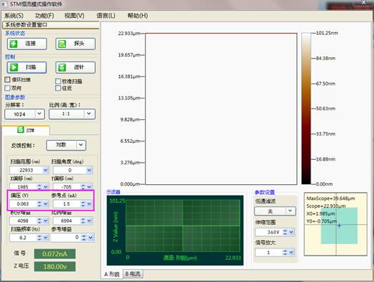 ②在打开的SPM Console 在线控制软件大视图中,找到系统设置窗口中的偏压参数文本框、参考点参数文本框,在文本框中输入合理的数据,设定合理的实验中扫描样品所需的偏压、参考点值。