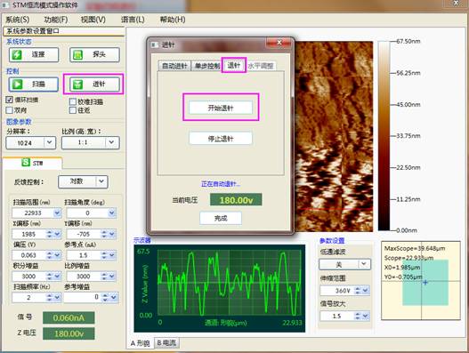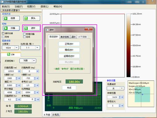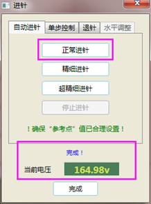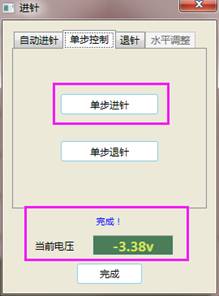 ②在进针窗口中的“自动进针”页面,单击“正常进针”按钮,开始自动进针操作,若完成自动进针后,Z电压过大,超于20V,可继续点击“自动进针”页面的精细进针或“单步控制”页面的单步进针,进行进一步进针,直至Z电压变化至0V左右,20V以内位置。
