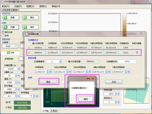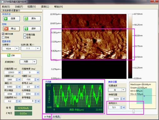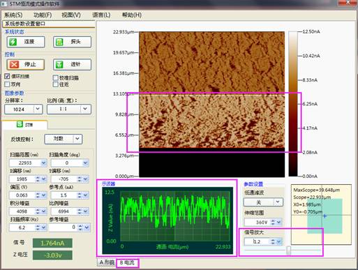 ③扫描样品过程中,鼠标点击“电流”选项卡,观察“电流”的“示波器”窗口中的扫描曲线,调节参数设置中的“信号放大”参数的数值,改变数据曲线的振幅,使示波器上的信号处于中间并不超过可测量的范围且可观察到合适对比度的扫描图像。