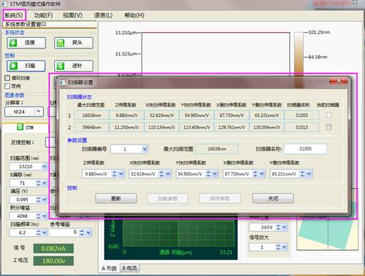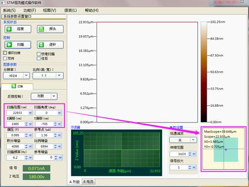 ①在打开的SPM Console 在线控制软件大视图中,找到系统设置窗口中的扫描范围、扫描角度、X偏移、Y偏移等参数文本框,改变文本框中的数值,并观察当前扫描区域概览中当前扫描区域的变化,设定好实验中想扫描的样品区域。