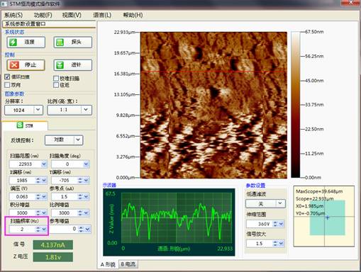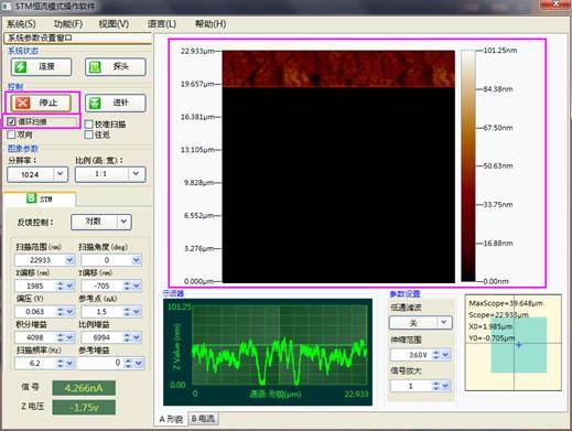 ①在打开的SPM Console 在线控制软件大视图中,找到系统设置窗口中“扫描”按钮,若直接鼠标单击“扫描”按钮,将进行一次样品扫描,一次扫描结束后,扫描自动停止。若选中扫描按钮下方的“循环扫描”后,再单击“扫描”按钮,将不停地重复扫描,直到点击“停止”,扫描终止。