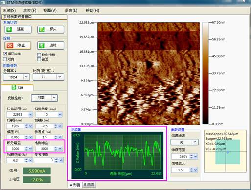 ②扫描样品过程中,观察“形貌通道”的“示波器”窗口中的扫描曲线,调节参数设置中的“信号放大”参数的数值,改变数据曲线的振幅,使示波器上的信号处于中间并不超过可测量的范围且可观察到合适对比度的扫描图像。